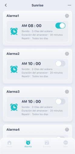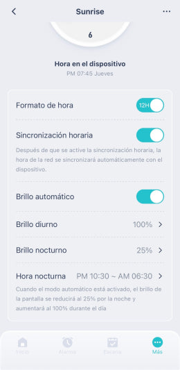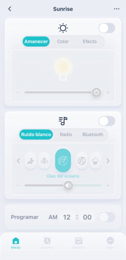 1. Configuras tu hora y el modo - Elige entre luz, sonidos naturales o Radio FM